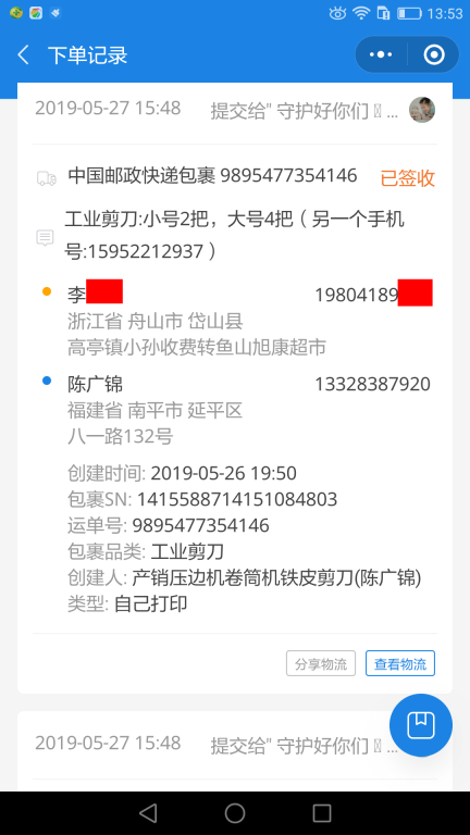 5月27日舟山客戶快遞單
