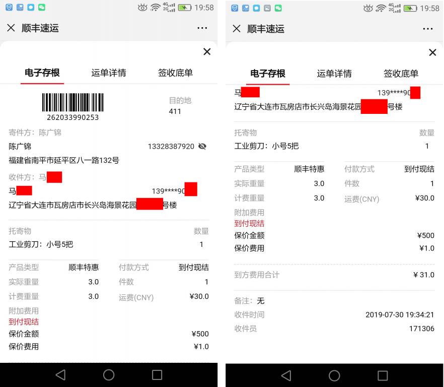 7月30日大連客戶快遞單